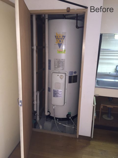 改修ポイントとして間取り変更(和室→洋室変更)・室内電気温水器→壁掛け追焚き式給湯器変更、独立洗面化粧台新設、洗濯機置場新設、給排水管更新工事となります。